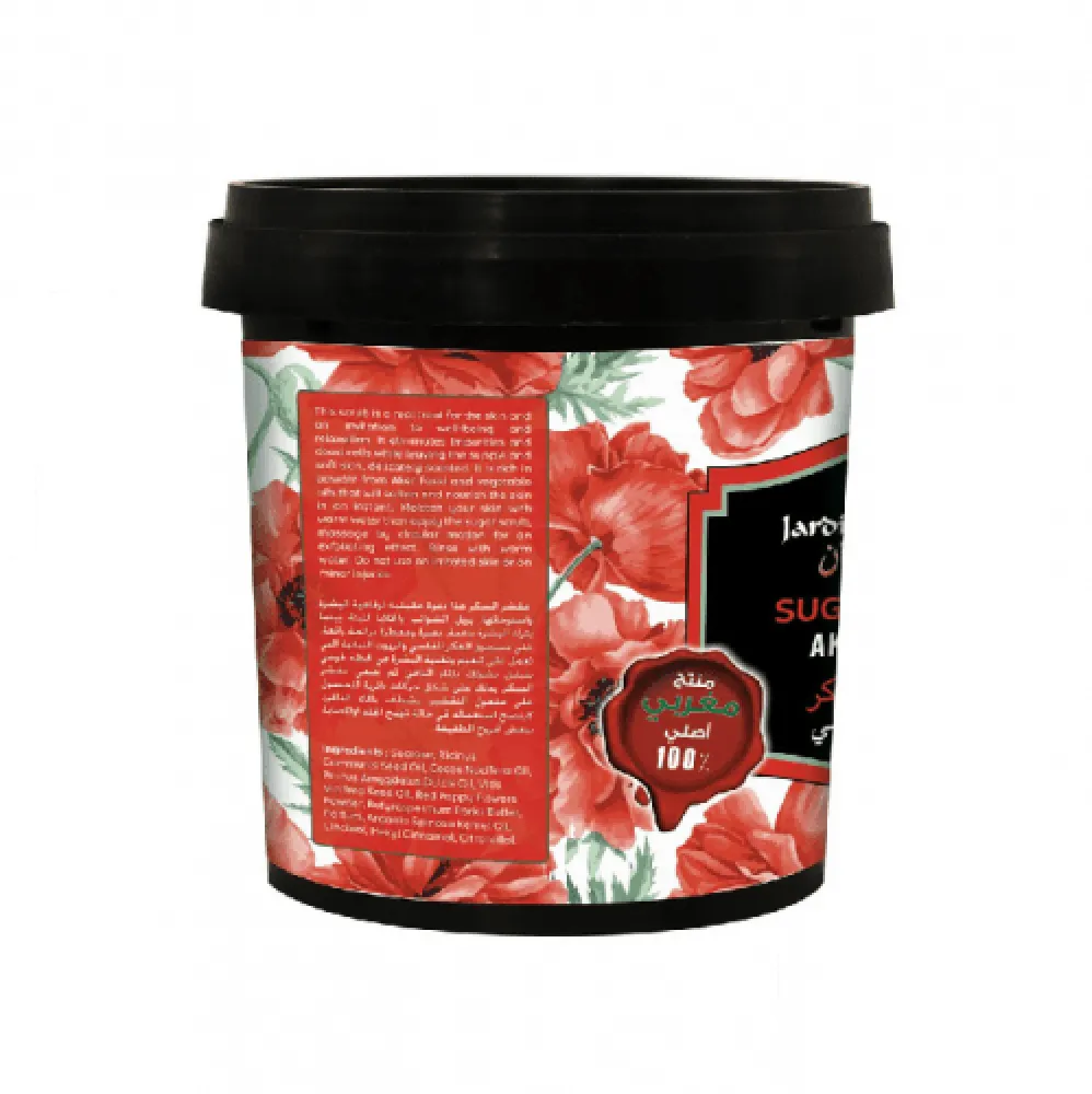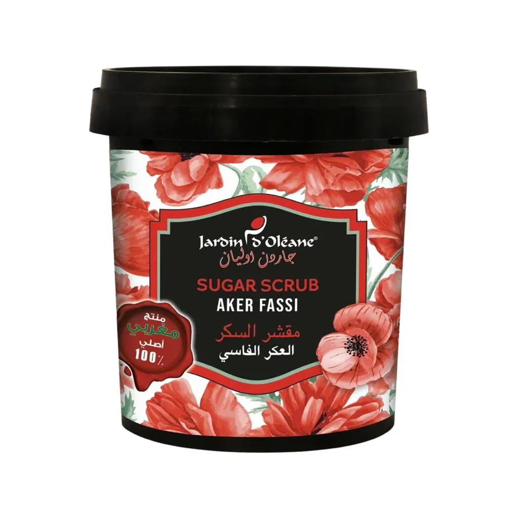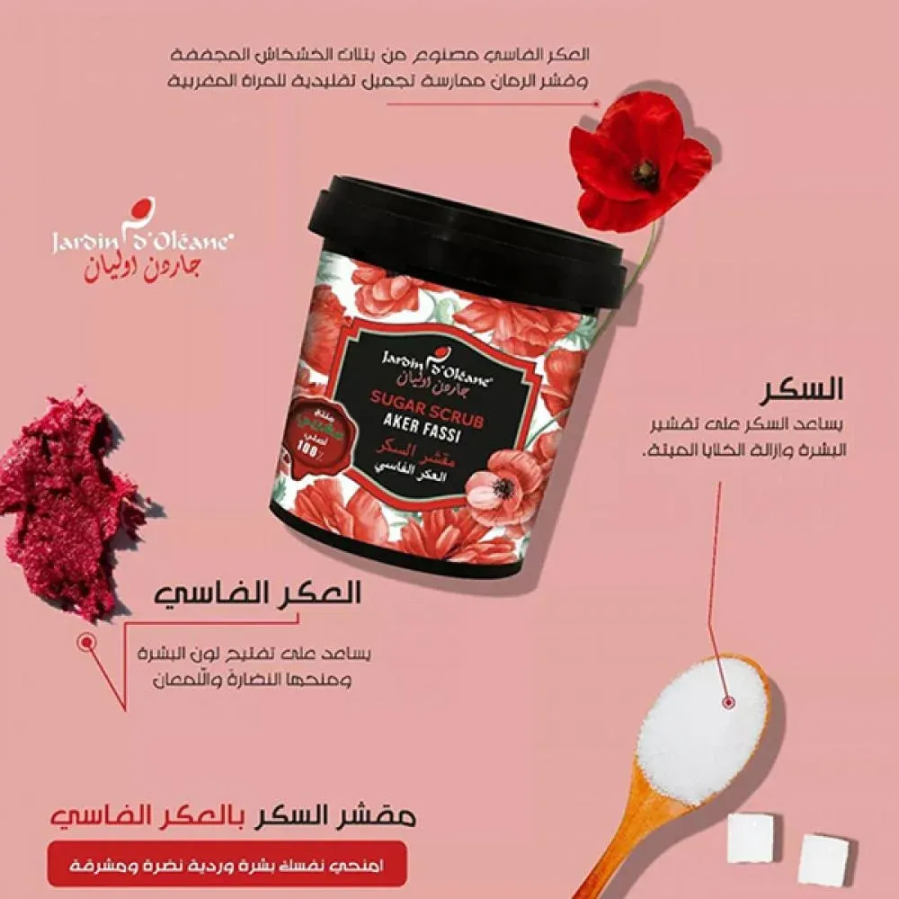 هذا المنتج هو مقشر ميكانيكي للجسم، صُمم لتنقية وتنعيم البشرة. يتميز بأساس من حبيبات السكر الطبيعية، التي تعمل كمادة كاشطة لطيفة لكن فعالة لإزالة خلايا الجلد الميتة والشوائب. ما يجعله فريداً هو إثراؤه بمكون “العكر الفاسي”، وهو مستحضر تجميلي مغربي تقليدي مصنوع من مسحوق أوراق زهرة شقائق النعمان وقشور الرمان. المقشر لا يهدف فقط إلى التنعيم، بل أيضاً إلى تفتيح البشرة وإضفاء نضارة وردية طبيعية عليها.
